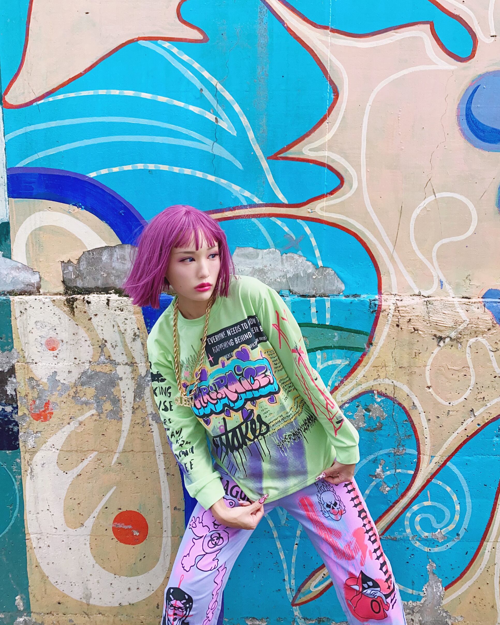 大活躍間違い無し の グラフティがプリントされたトップス です
